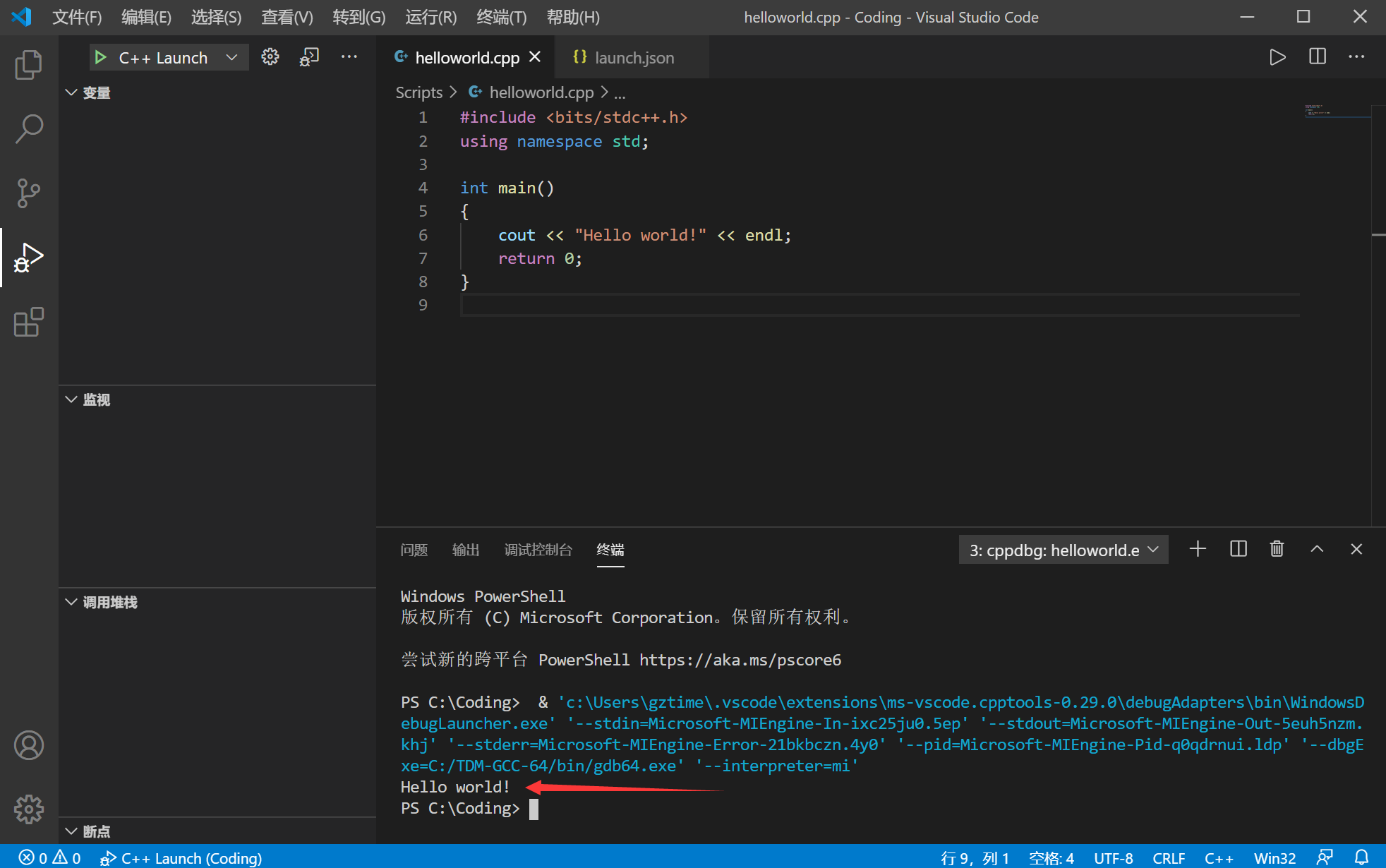 Scripts文件夹中新建文件helloworld.cpp,写下传统的 helloworld 程序。#include <bits/stdc++.h> using namespace std; int main() { cout << "Hello world!" << endl; return 0; }单击左侧菜单中的