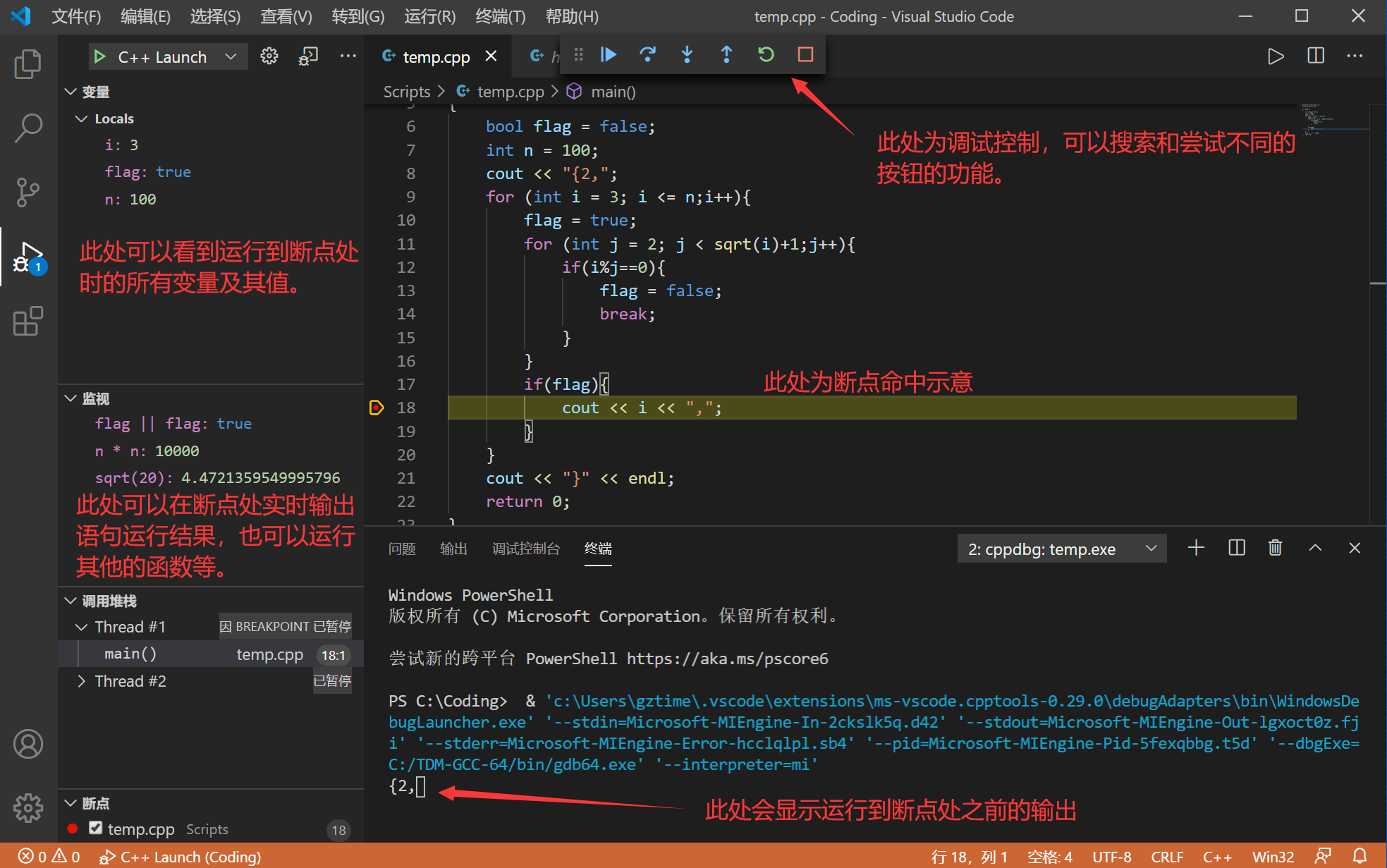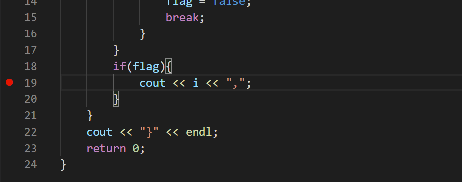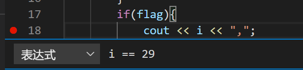 #include <bits/stdc++.h> using namespace std; int main() { bool flag = false; int n = 100; cout << "{2, "; for (int i = 3; i <= n; ++i){ flag = true; for (int j = 2; j < sqrt(i) + 1; ++j){ if(i % j == 0){ flag = false; break; } } if(flag){ cout << i << ", "; } } cout << "}" << endl; return 0; }点击行号左侧进行“打断点”操作,程序会在红点处暂停运行。